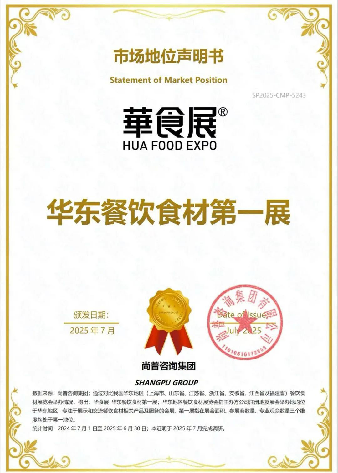 2025年7月,华食展荣获尚普咨询颁发的“华东餐饮食材第一展”的市场地位认证,在展会面积、参展商数量、专业观众数量三个维度均处于华东地区第一的地位,成为本地区餐饮食材行业的重要平台。