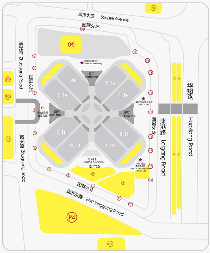 ① 延安高架、南部外环高速方向:嘉闵高架-建虹高架-盈港东路-诸光路-崧泽大道-国家会展中心(上海)
